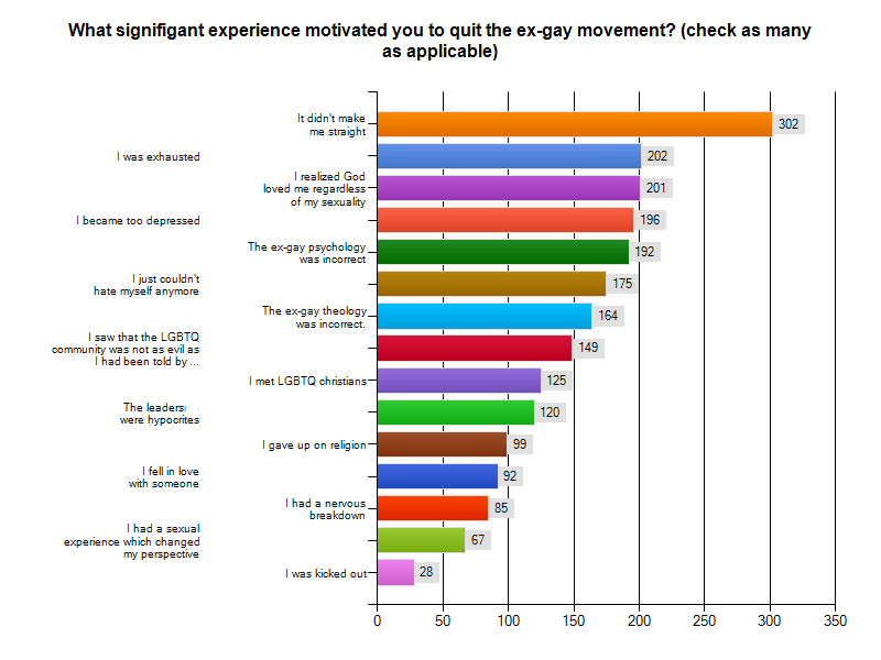 Way out in the lead of all the other options (by 100 people) is that the SOCE did not make them heterosexual. 85 people (22% of the participants who answered this question) said they had a nervous breakdown. Whether or not all of these were actual physiological diagnoses is not clear, but it is disturbing to think that SOCE brought on so many of these kinds of severely negative experiences. Also, it’s supremely important to point out that four different comments below mention being sexually abused by their “ex-gay therapist.” It would be nice to think that the “significant experience” that motivated survivors to quit SOCE’s would be happy or inspiring occasions, and some of them are. Unfortunately, all too often it is the dark, deeply wounding, devastating experiences that finally brings survivors to their senses, and some of the stories below are no less than gut-wrenching.